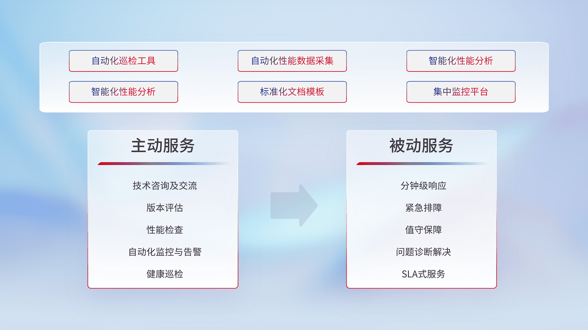 智能化工具和标准化文档,,保障服务质量,,,提供主动服务(包含技术咨询、、、、版本评估、、性能检查、、、、自动化监控与告警、、、、健康巡检)和被动服务包含(分钟级响应、、、、紧急排障、、、值守保障、、、问题诊断解决、、、SLA服务)。。